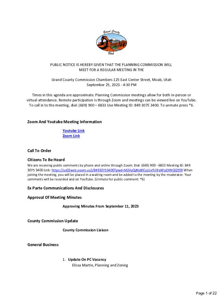 PUBLIC NOTICE IS HEREBY GIVEN THAT THE PLANNING COMMISSION WILL MEET FOR A REGULAR MEETING IN THE Grand County Commission Chambers 125 East Center Street, Moab, Utah September 25, 2023 4:30 PM Times