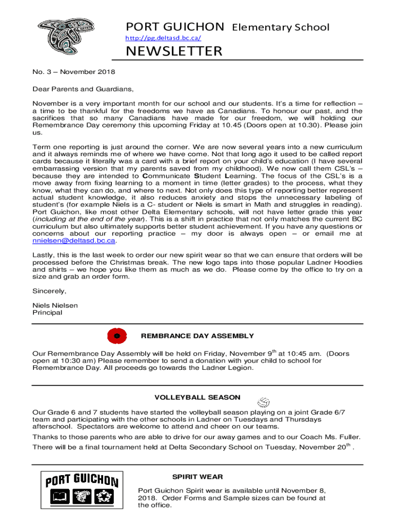 PORT GUICHON Elementary School http://pg.deltasd.bc.ca/NEWSLETTER No. 3 November 2018 Dear Parents and Guardians, November is a very important month for our school and our students. Its a time for