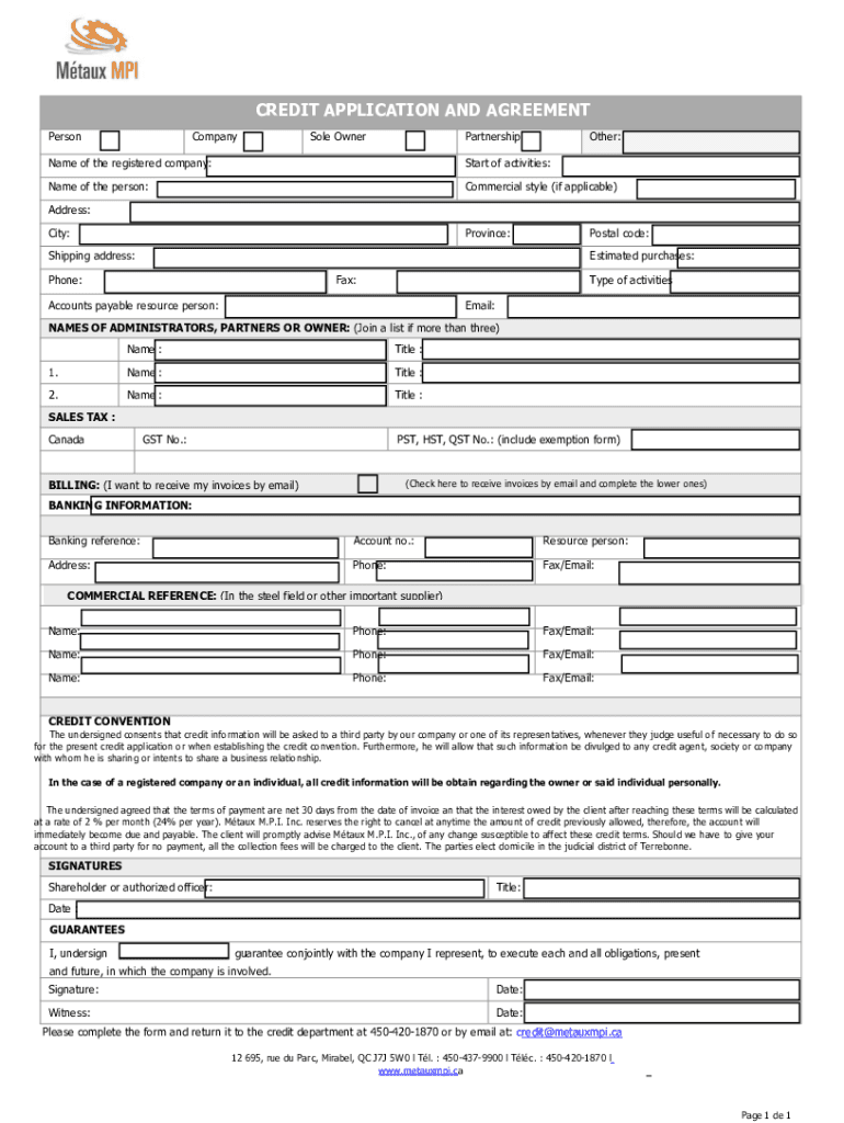 CREDIT APPLICATION AND AGREEMENT PersonCompanySole OwnerPartnershipOther:Name of the registered company:Start of activities:Name of the person:Commercial style (if applicable)Address: City:Province:Shipping