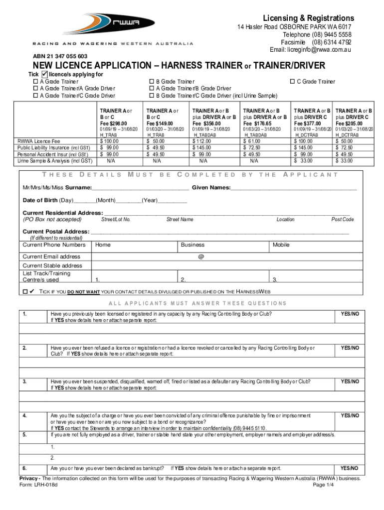 Licensing & Registrations 14 Hasler Road OSBORNE PARK WA 6017 Telephone (08) 9445 5558 Facsimile (08) 6314 4792 Email: licreginfo@rwwa.com.au ABN 21 347 055 603NEW LICENCE APPLICATION HARNESS TRAINER