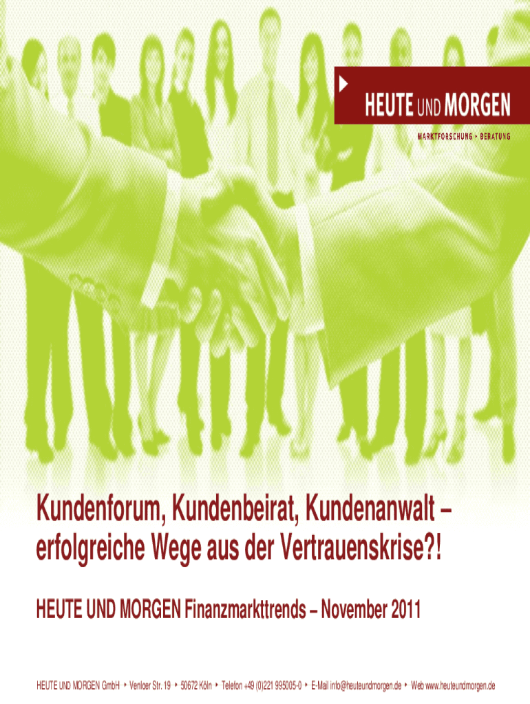 Kundenforum, Kundenbeirat, Kundenanwalt erfolgreiche Wege aus der Vertrauenskrise?! HEUTE UND MORGEN Finanzmarkttrends November 2011 HEUTE UND MORGEN GmbHVenloer Str. 1950672 KlnTelefon +49 (0)221