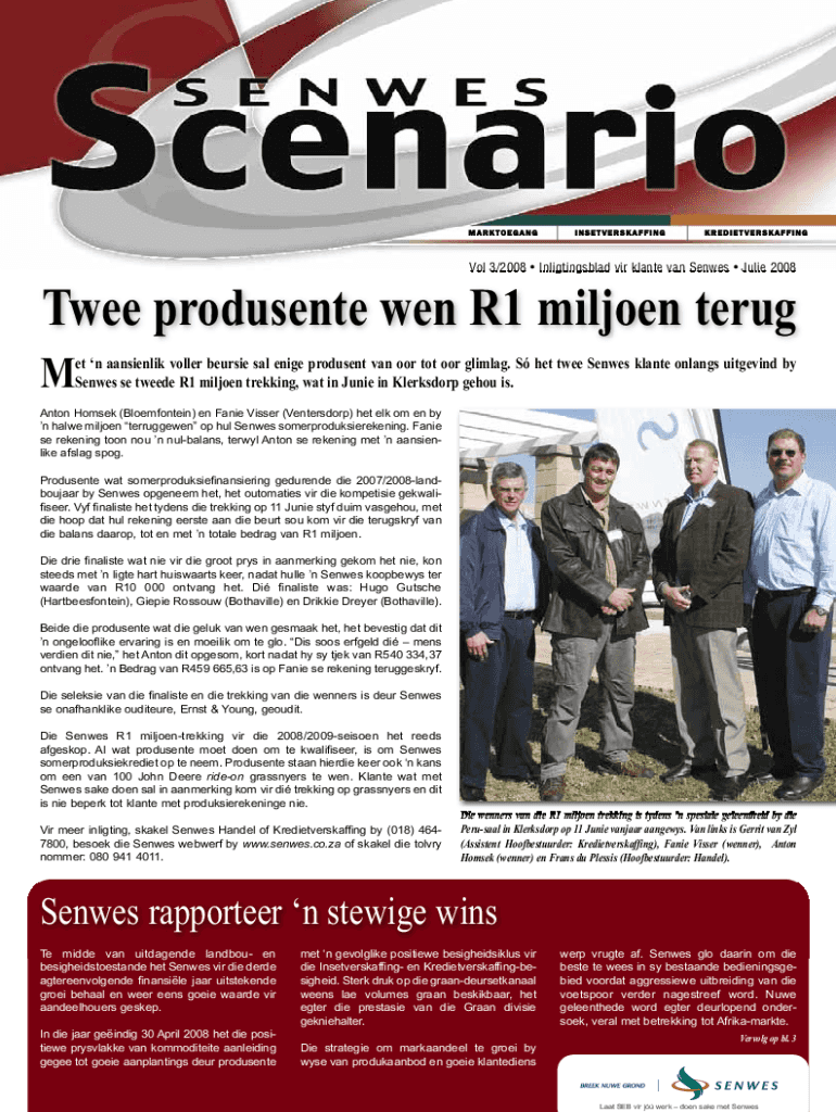 MARKTOEGANGINSET VERSKAFFINGKREDIET VERSKAFFINGVol 3/2008 Inligtingsblad vir klante van Senwes Julie 2008Twee produsente wen R1 miljoen terug et n aansienlik voller beursie sal enige produsent van