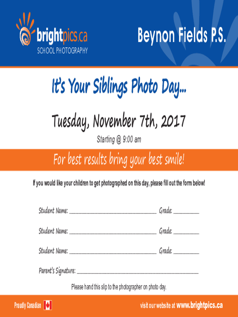 .caSCHOOL PHOTOGRAPHYBeynon Fields P.S.Its Your Siblings Photo Day... Tuesday, November 7th, 2017 Starting @ 9:00 amFor best results bring your best smile! If you would like your children to get photographed