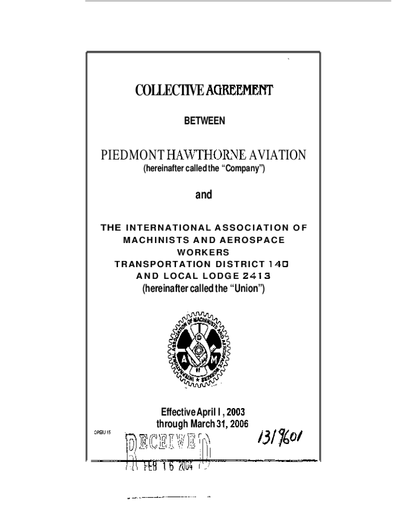 COLLECTIVE AClREEMENT BETWEENPIEDMONT H A W H O R N E AVIATION (hereinafter called the Company)and THE I N T E R N A T I O N A L A S S O C I A T I O N O F MACHINISTS A N D AEROSPACE WORKERS TRANSPORTATION
