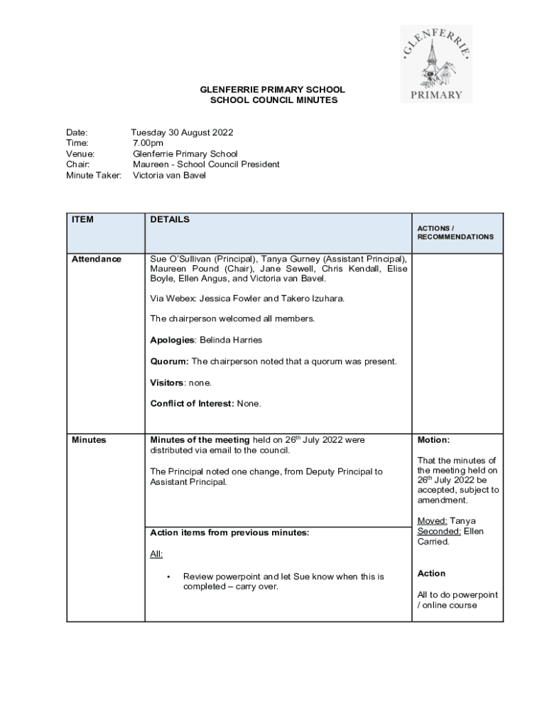 GLENFERRIE PRIMARY SCHOOL SCHOOL COUNCIL MINUTESDate: Tuesday 30 August 2022 Time: 7.00pm Venue: Glenferrie Primary School Chair: Maureen School Council President Minute Taker: Victoria van BavelITEMDETAILS