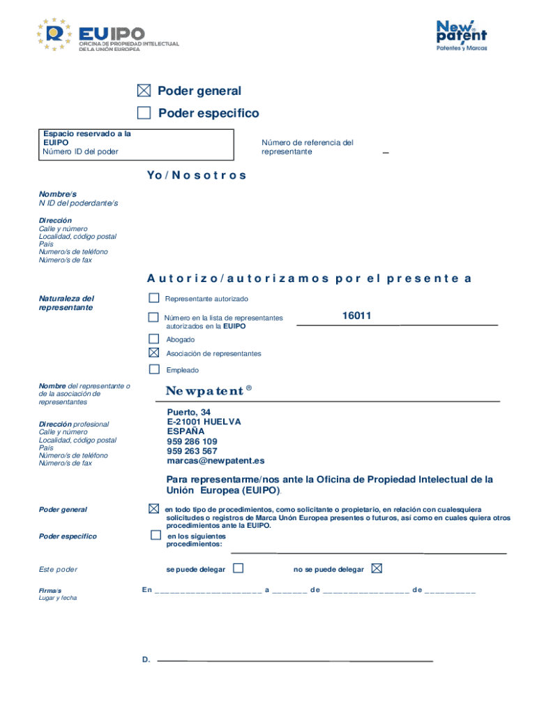 Poder general Poder especifico Espacio reservado a la EUIPO Nmero ID del poderNmero de referencia del representanteYo / N o s o t r o s Nombre/s N ID del poderdante/s Direccin Calle y nmero Localidad,