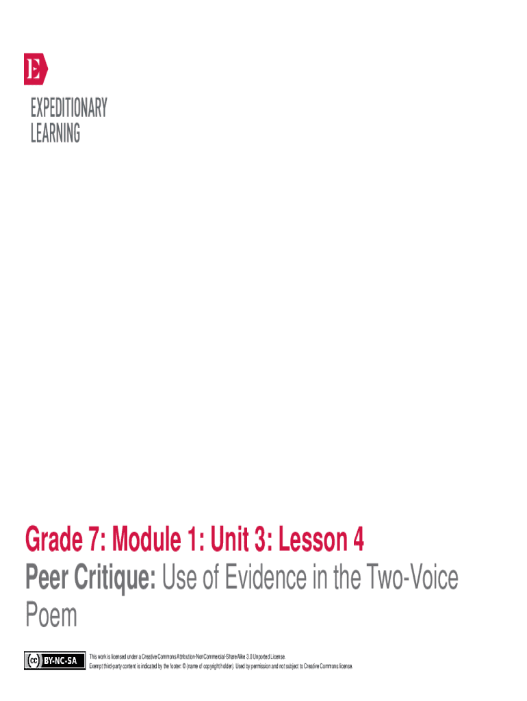 Grade 7: Module 1: Unit 3: Lesson 4 Peer Critique: Use of Evidence in the TwoVoice Poem This work is licensed under a Creative Commons AttributionNonCommercialShareAlike 3.0 Unported License. Exempt