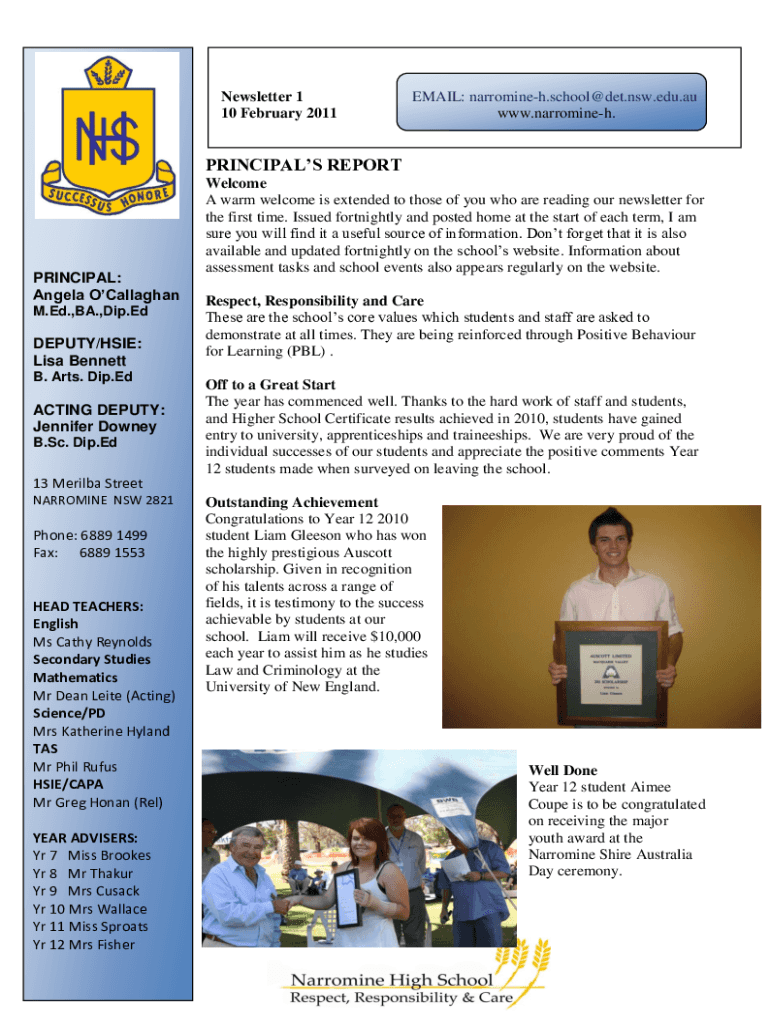 Newsletter 1 10 February 2011EMAIL: narromineh.school@det.nsw.edu.au www.narromineh.PRINCIPALS REPORTPRINCIPAL: Angela OCallaghan M.Ed.,BA.,Dip.EdDEPUTY/HSIE: Lisa Bennett B. Arts. Dip.EdACTING DEPUTY: