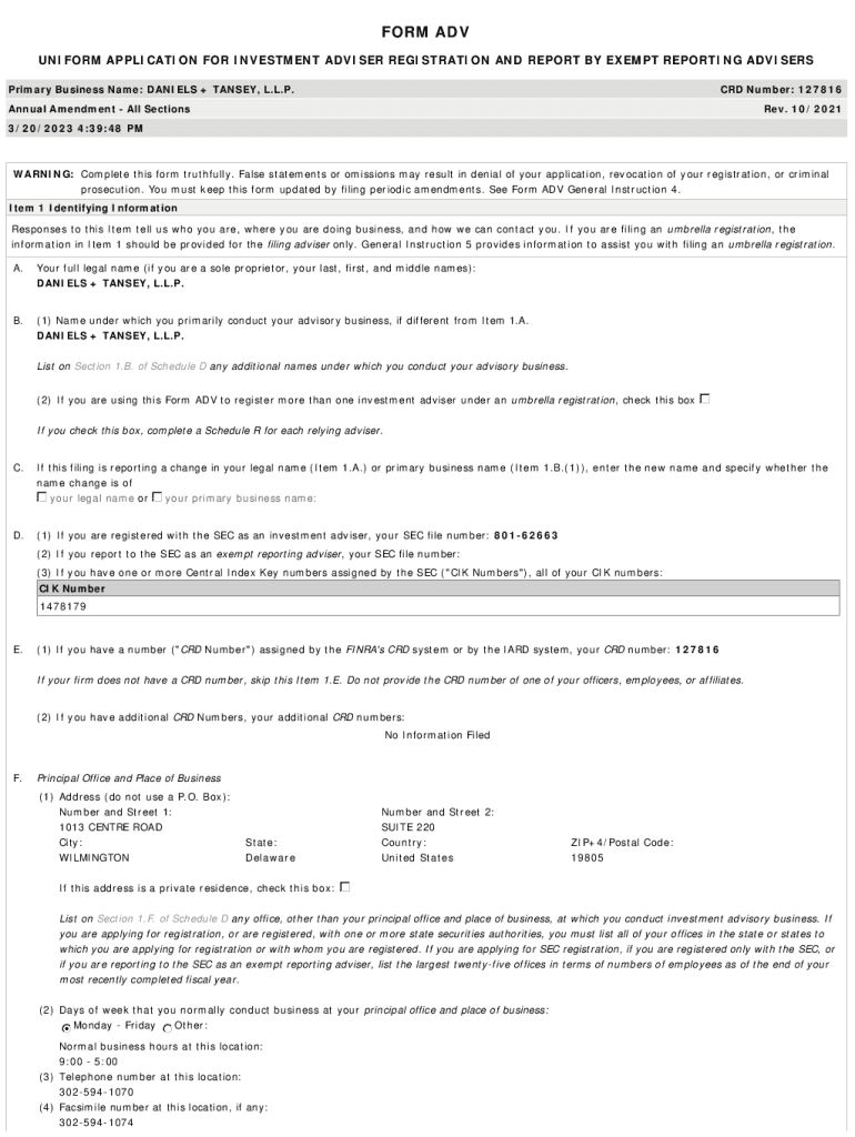 FORM ADV UNIFORM APPLICATION FOR INVESTMENT ADVISER REGISTRATION AND REPORT BY EXEMPT REPORTING ADVISERS Primary Business Name: DANIELS + TANSEY, L.L.P.CRD Number: 127816Annual Amendment All SectionsRev.