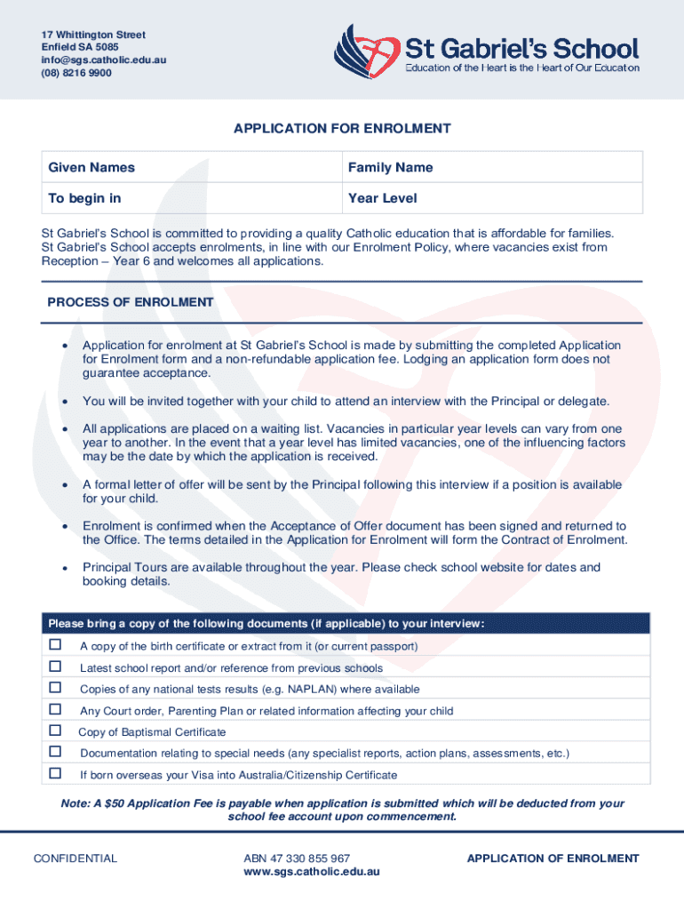 17 Whittington Street Enfield SA 5085 info@sgs.catholic.edu.au (08) 8216 9900APPLICATION FOR ENROLMENT Given NamesFamily NameTo begin inYear LevelSt Gabriels School is committed to providing a quality