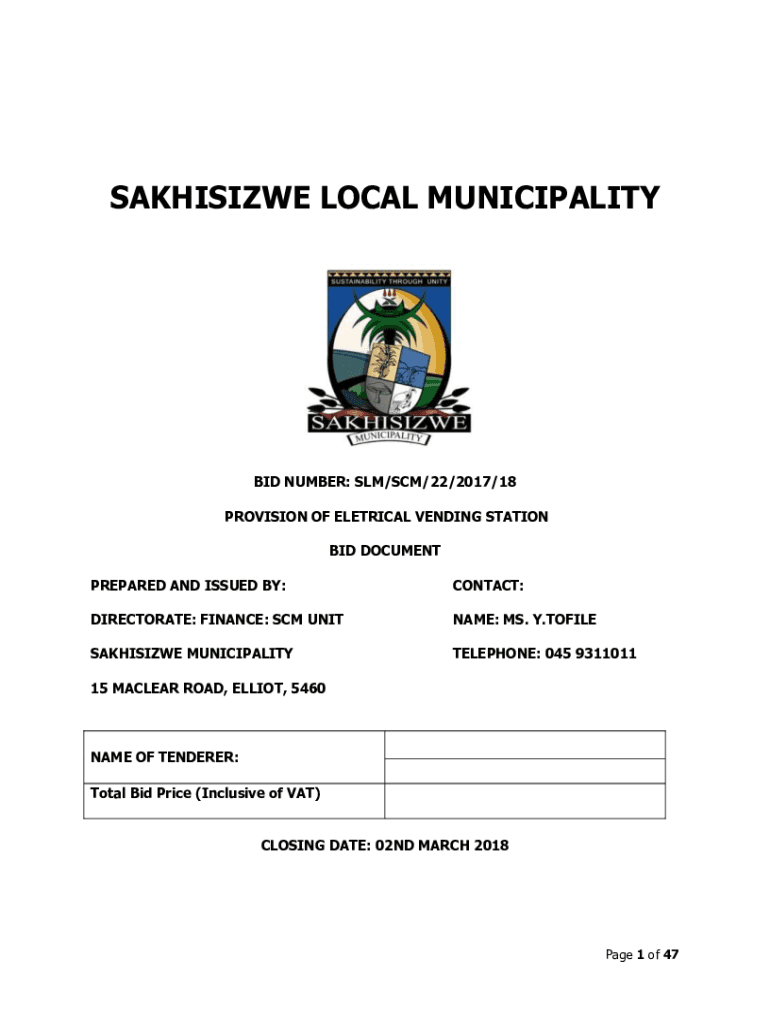 SAKHISIZWE LOCAL MUNICIPALITYBID NUMBER: SLM/SCM/22/2017/18 PROVISION OF ELETRICAL VENDING STATION BID DOCUMENT PREPARED AND ISSUED BY:CONTACT:DIRECTORATE: FINANCE: SCM UNITNAME: MS. Y.TOFILESAKHISIZWE