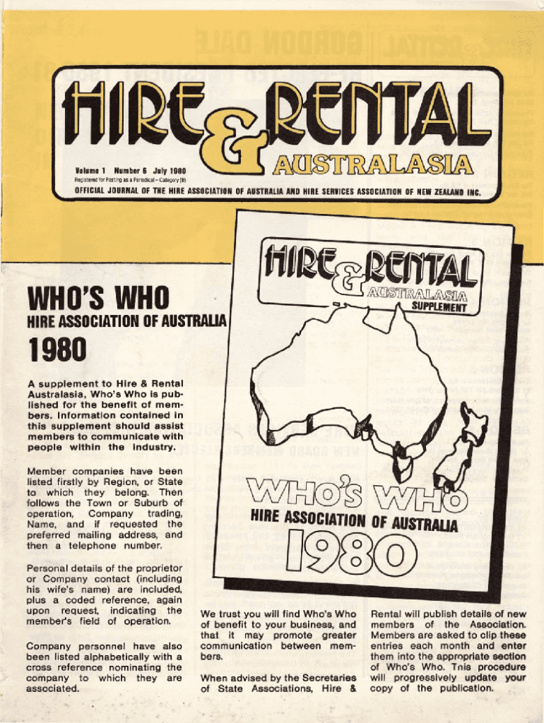 Volume 1 Number 6 July 1980 Registered for Posting as a Periodical Category (B)OFFICIAL JOURNAL OF THE HIRE ASSOCIATION OF AUSTRALIA AND HIRE SERVICES ASSOCIATION OF NEW ZEALAND INC.WHO\'S WHOHIRE