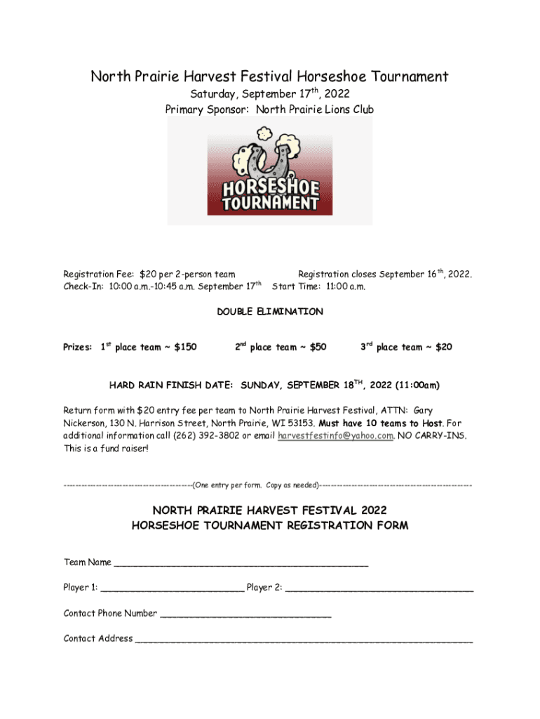 North Prairie Harvest Festival Horseshoe Tournament Saturday, September 17th, 2022 Primary Sponsor: North Prairie Lions ClubRegistration Fee: $20 per 2person team CheckIn: 10:00 a.m.10:45 a.m. September