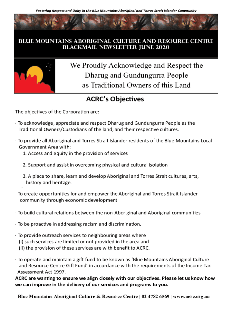 Fostering Respect and Unity in the Blue Mountains Aboriginal and Torres Strait Islander CommunityA B O R I G I N A LC U L T U R E&R E S O U C EC E N T R EBlue Mountains Aboriginal Culture and Resource