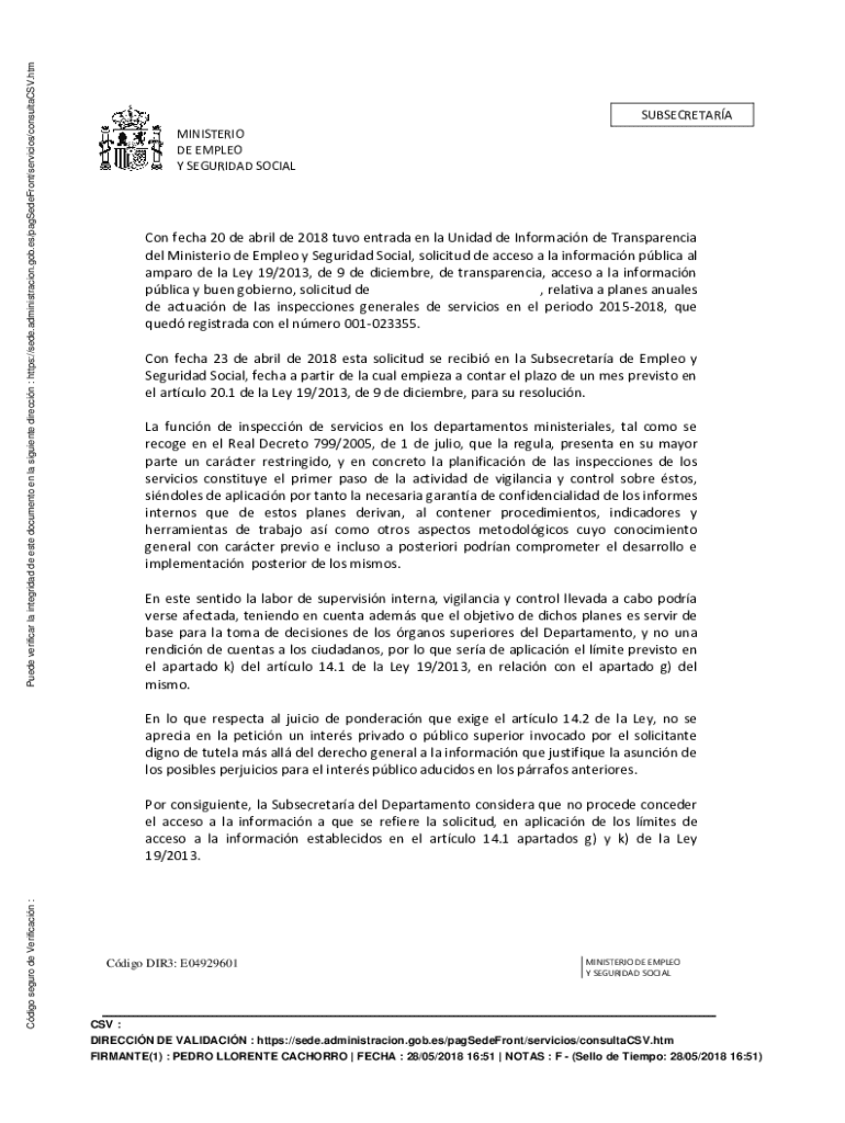 Puede verificar la integridad de este documento en la siguiente direccin : https://sede.administracion.gob.es/pagSedeFront/servicios/consultaCSV.htmSUBSECRETARA MINISTERIO DE EMPLEO Y SEGURIDAD SOCIALCon