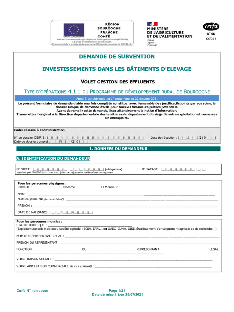 nen coursDEMANDE DE SUBVENTION INVESTISSEMENTS DANS LES BTIMENTS DELEVAGE VOLET TYPE DOPRATIONS 4.1.1GESTION DES EFFLUENTSPROGRAMMEDUDE DVELOPPEMENT RURAL DEBOURGOGNEAppel candidatures du 1er septembre