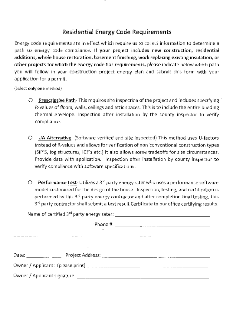 Residential Energy Code RequirementsEnergy code requirements are in effect which require us to collect information to determine a path to energy code compliance. If your project includes new construction,
