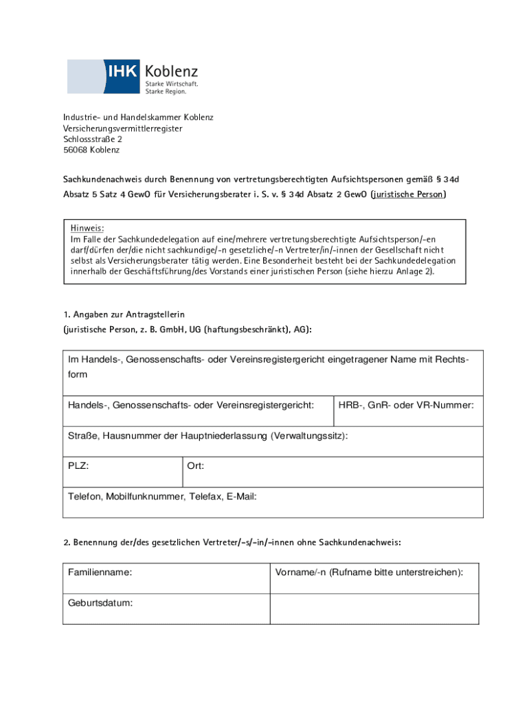 Industrie und Handelskammer Koblenz Versicherungsvermittlerregister Schlossstrae 2 56068 Koblenz Sachkundenachweis durch Benennung von vertretungsberechtigten Aufsichtspersonen gem 34d Absatz 5 Satz
