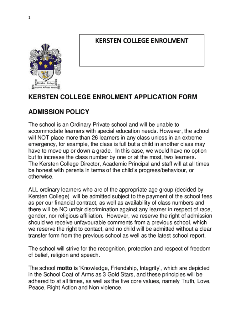 1KERSTEN COLLEGE ENROLMENTKERSTEN COLLEGE ENROLMENT APPLICATION FORM ADMISSION POLICY The school is an Ordinary Private school and will be unable to accommodate learners with special education needs.