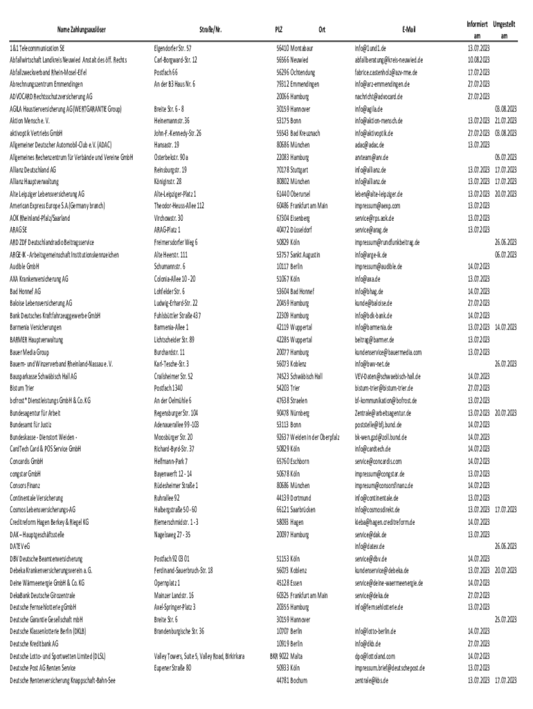 Name Zahlungsauslser 1&1 Telecommunication SE Abfallwirtschaft Landkreis Neuwied Anstalt des ff. Rechts Abfallzweckverband RheinMoselEifel Abrechnungszentrum Emmendingen ADVOCARD Rechtsschutzversicherung