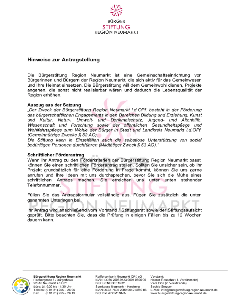 Hinweise zur Antragstellung Die Brgerstiftung Region Neumarkt ist eine Gemeinschaftseinrichtung von Brgerinnen und Brgern der Region Neumarkt, die sich aktiv fr das Gemeinwesen und Ihre Heimat einsetzen.