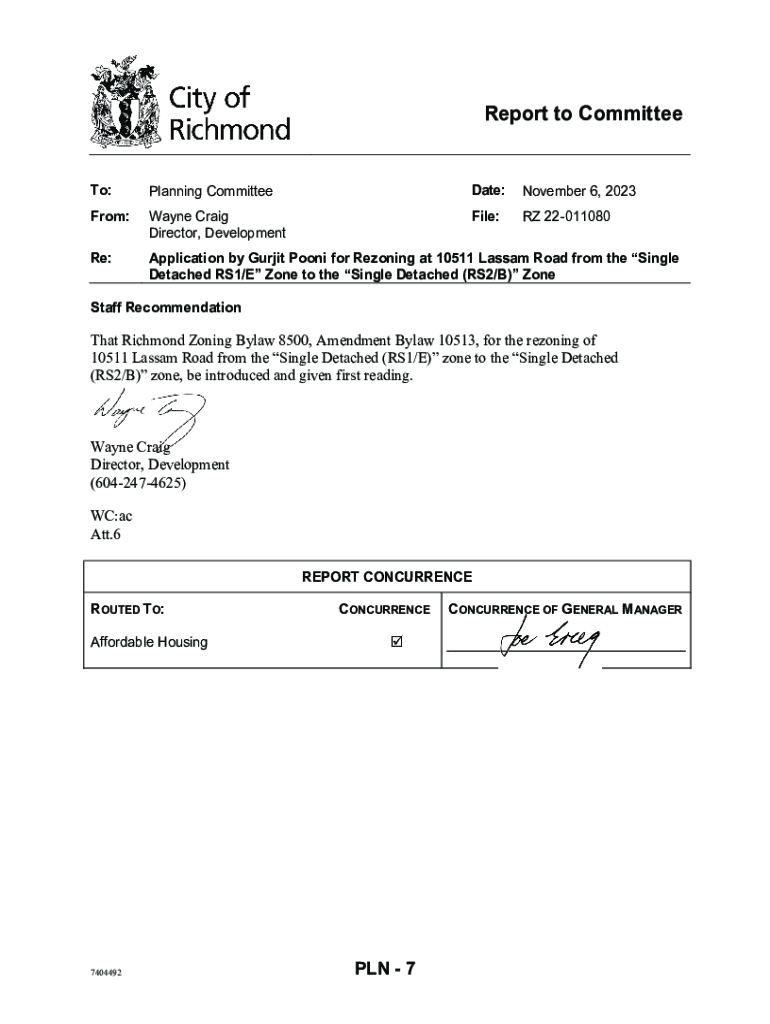 Report to CommitteeTo:Planning CommitteeDate:November 6, 2023From:Wayne Craig Director, DevelopmentFile:RZ 22011080Re:Application by Gurjit Pooni for Rezoning at 10511 Lassam Road from the Single