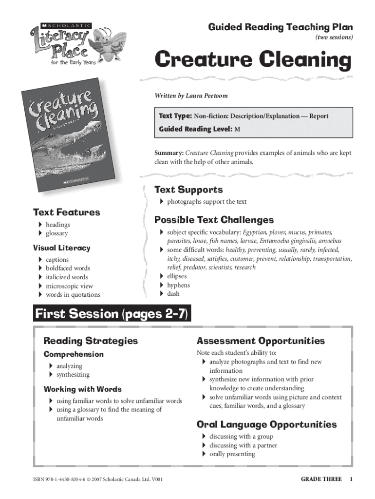 Guided Reading Teaching Plan (two sessions)Creature Cleaning Written by Laura Peetoom Text Type: Nonfiction: Description/Explanation Report Guided Reading Level: M Summary: Creature Cleaning provides