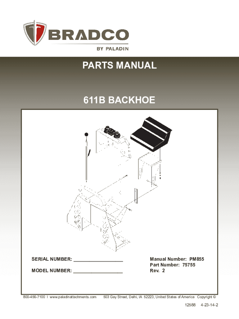 PARTS MANUAL 611B BACKHOESERIAL NUMBER: ___MODEL NUMBER: ___8004567100 I www.paladinattachments.comManual Number: PM855 Part Number: 75755 Rev. 2503 Gay Street, Delhi, IA 52223, United States of America