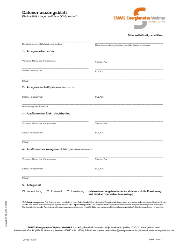 Datenerfassungsblatt Photovoltaikanlagen mit/ohne DCSpeicher*Bitte vollstndig ausfllen! ______Registriernummer (falls bereits vorhanden)MarktstammdatenregisterNummer (falls bereits vorhanden)1) Anlagenbetreiber/in