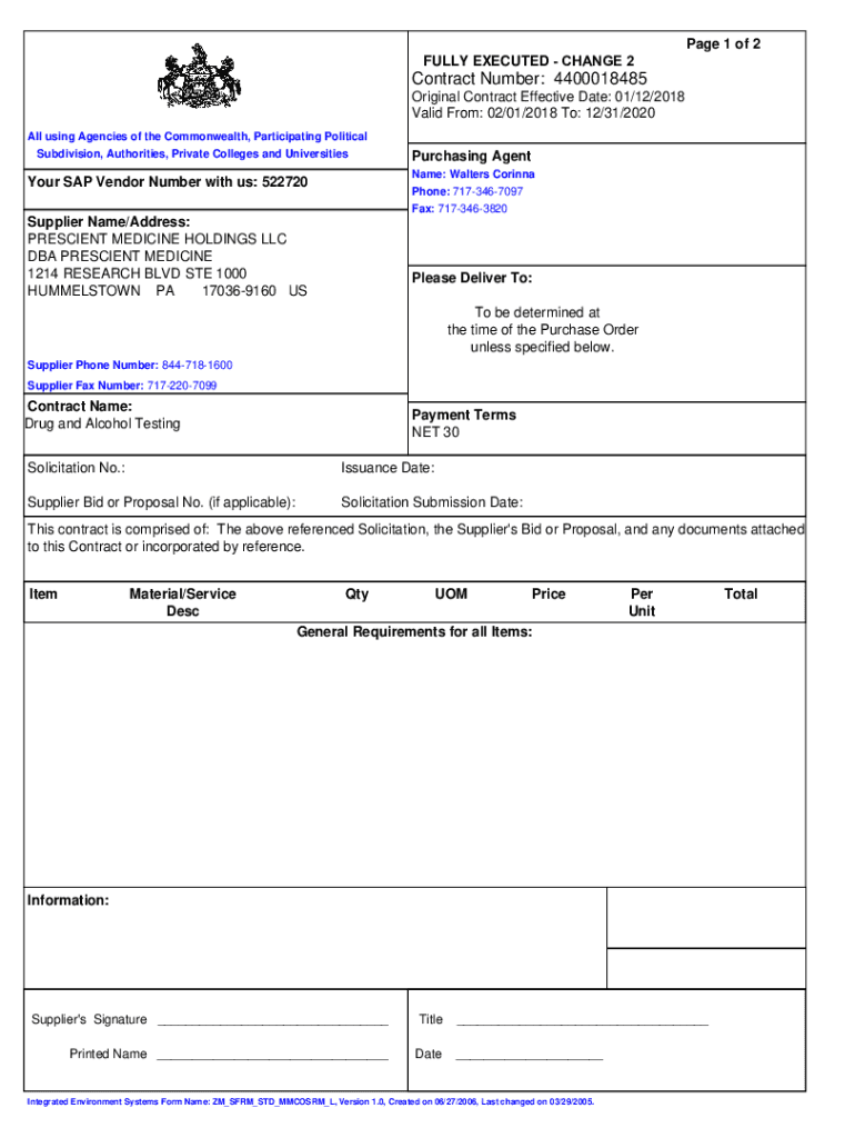 FULLY EXECUTED CHANGE 2Page 1 of 2Contract Number: 4400018485 Original Contract Effective Date: 01/12/2018 Valid From: 02/01/2018 To: 12/31/2020 All using Agencies of the Commonwealth, Participating