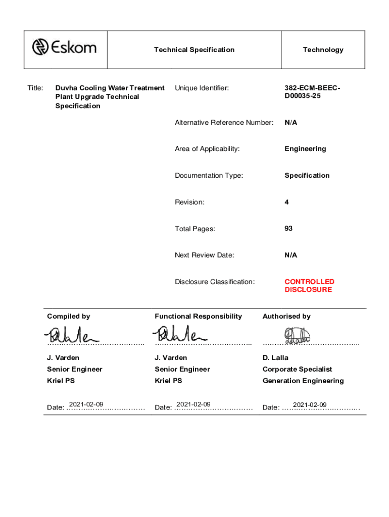 Technical SpecificationTitle:Duvha Cooling Water Treatment Plant Upgrade Technical SpecificationTechnologyUnique Identifier:382ECMBEECD0003525Alternative Reference Number:N/AArea of Applicability:EngineeringDocumentation
