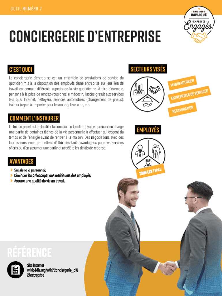 OUTI L NUM RO 7Conciergerie dentreprise Cest quoiSecteurs vissLa conciergerie d\'entreprise est un ensemble de prestations de service du quotidien mis la disposition des employs d\'une entreprise