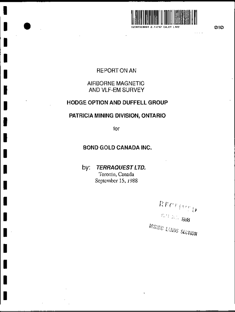 l l l l520*7SEeeiei4 2.11747 CALEY LAKE010RE PORT ON ANlAIRBORNE MAGNETIC AND VLFEM SURVEYBHODGE OPTION AND DUFFELL GROUP PATRICIA MINING DIVISION, ONTARIOforl BOND GOLD CANADA INC.l .l l l l l lby:TERRAQUEST