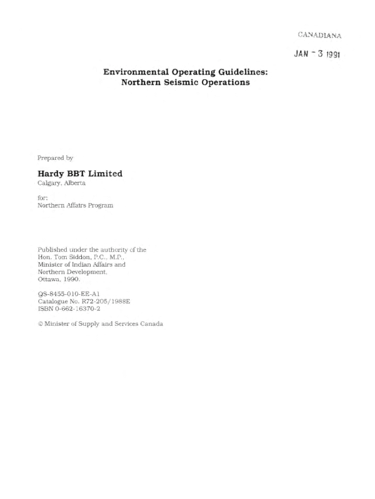 CAN AD lANAJAN 3 199\'Environmental Operating Guidelines: Northern Seismic OperationsPrepared byHardy BBT Limited Calgary. Alberta for: Northern Mfairs ProgramPublished under the authority of the