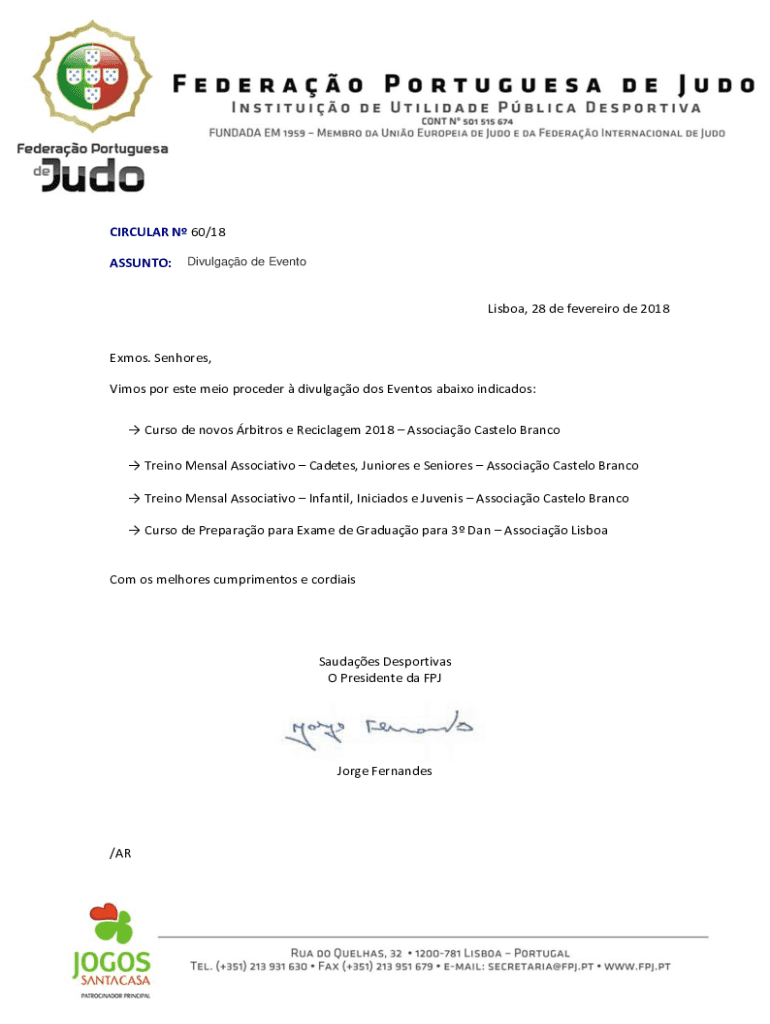 CIRCULAR N 60/18 ASSUNTO:Divulgao de EventoLisboa, 28 de fevereiro de 2018Exmos. Senhores, Vimos por este meio proceder divulgao dos Eventos abaixo indicados: Curso de novos rbitros e Reciclagem 2018