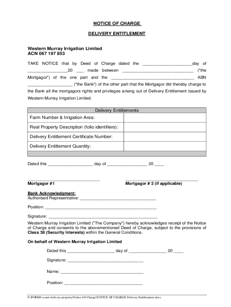 NOTICE OF CHARGE DELIVERY ENTITLEMENTWestern Murray Irrigation Limited ACN 067 197 853 TAKE NOTICE that by Deed of Charge dated the ___day of ___20 ___ made between ___ (\"the Mortgagor\") of the