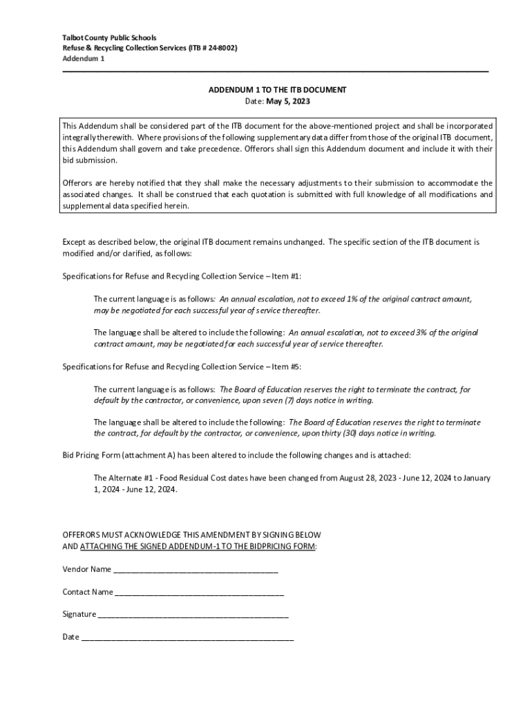 Talbot County Public Schools Refuse & Recycling Collection Services (ITB # 248002) Addendum 1 ___ADDENDUM 1 TO THE ITB DOCUMENT Date: May 5, 2023 This Addendum shall be considered part of the ITB