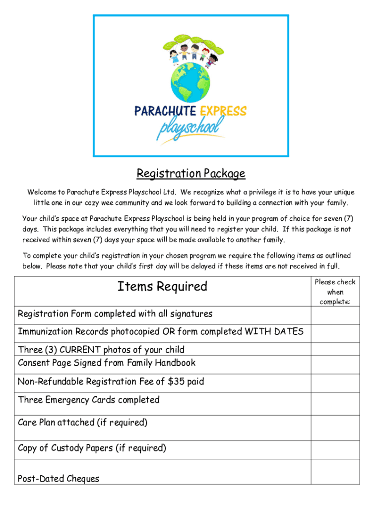 Registration Package Welcome to Parachute Express Playschool Ltd. We recognize what a privilege it is to have your unique little one in our cozy wee community and we look forward to building a connection