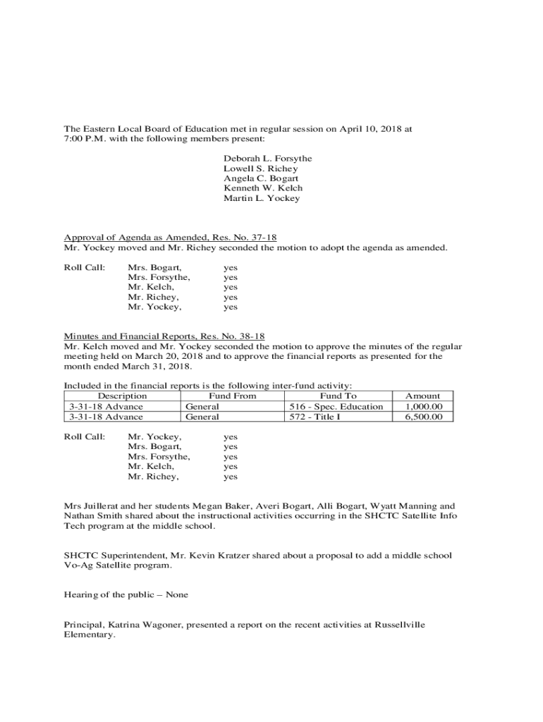 The Eastern Local Board of Education met in regular session on April 10, 2018 at 7:00 P.M. with the following members present: Deborah L. Forsythe Lowell S. Richey Angela C. Bogart Kenneth W. Kelch