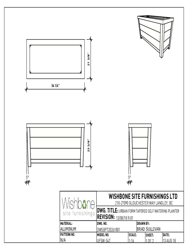 21 3/8\" 23 3/8\"54 1/4\"55WISHBONE SITE FURNISHINGS LTD 21027090 GLOUCHESTER WAY LANGLEY, BCDWG. TITLE: URBAN FORM TAPERED SELF WATERING PLANTER REVISION: 13/08/18 R:01 MATERIAL:DWG. NO.DRAWN BY:ALUMINUMDWSBPT20261801PATTERN