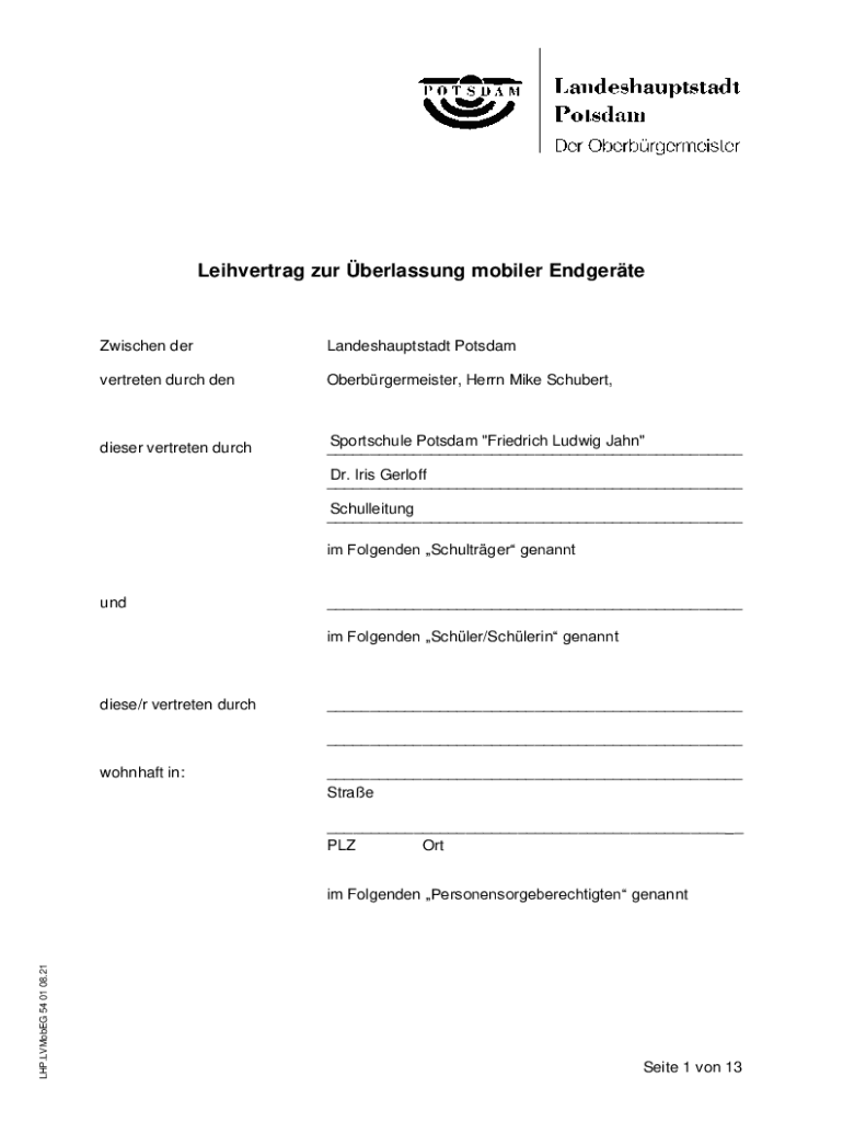 Leihvertrag zur berlassung mobiler EndgerteZwischen derLandeshauptstadt Potsdamvertreten durch denOberbrgermeister, Herrn Mike Schubert,dieser vertreten durchSportschule Potsdam \"Friedrich Ludwig