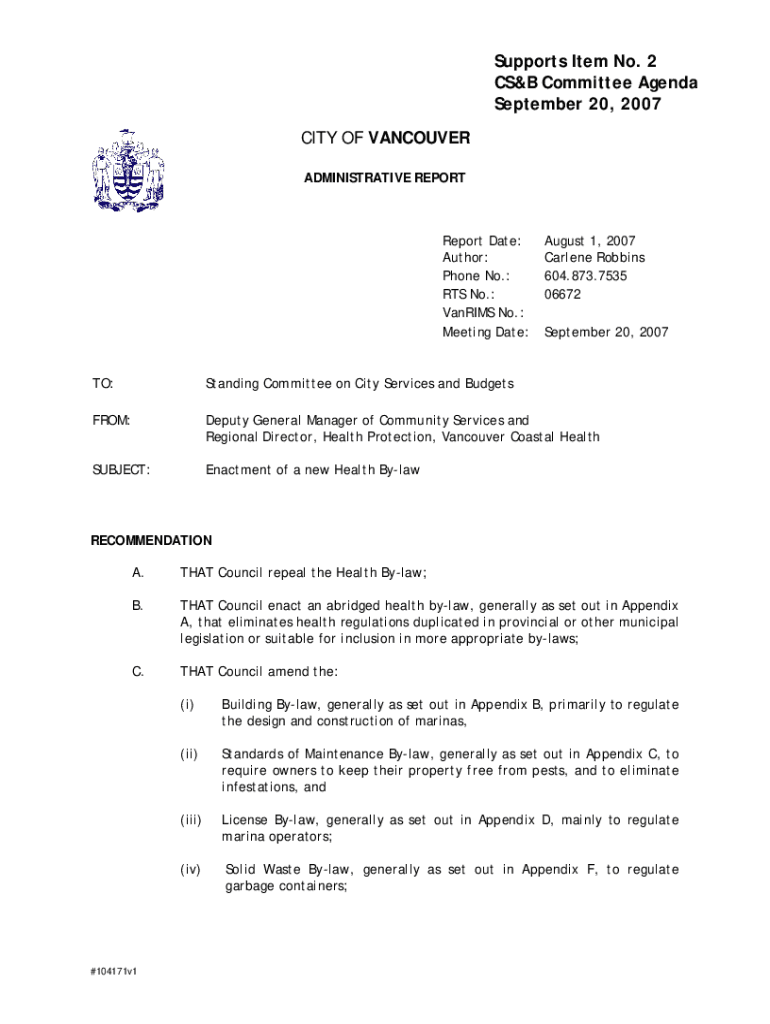 Supports Item No. 2 CS&B Committee Agenda September 20, 2007 CITY OF VANCOUVER ADMINISTRATIVE REPORTReport Date: Author: Phone No.: RTS No.: VanRIMS No.: Meeting Date:August 1, 2007 Carlene Robbins