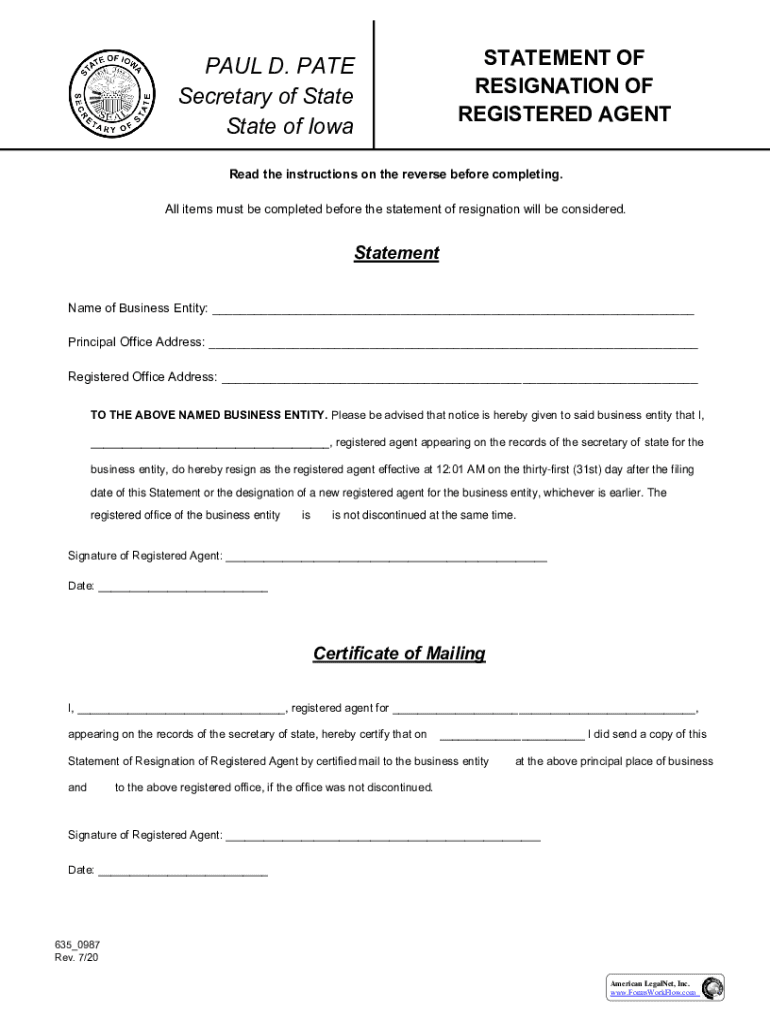 PAUL D. PATE Secretary of State State of IowaSTATEMENT OF RESIGNATION OF REGISTERED AGENTRead the instructions on the reverse before completing. All items must be completed before the statement of