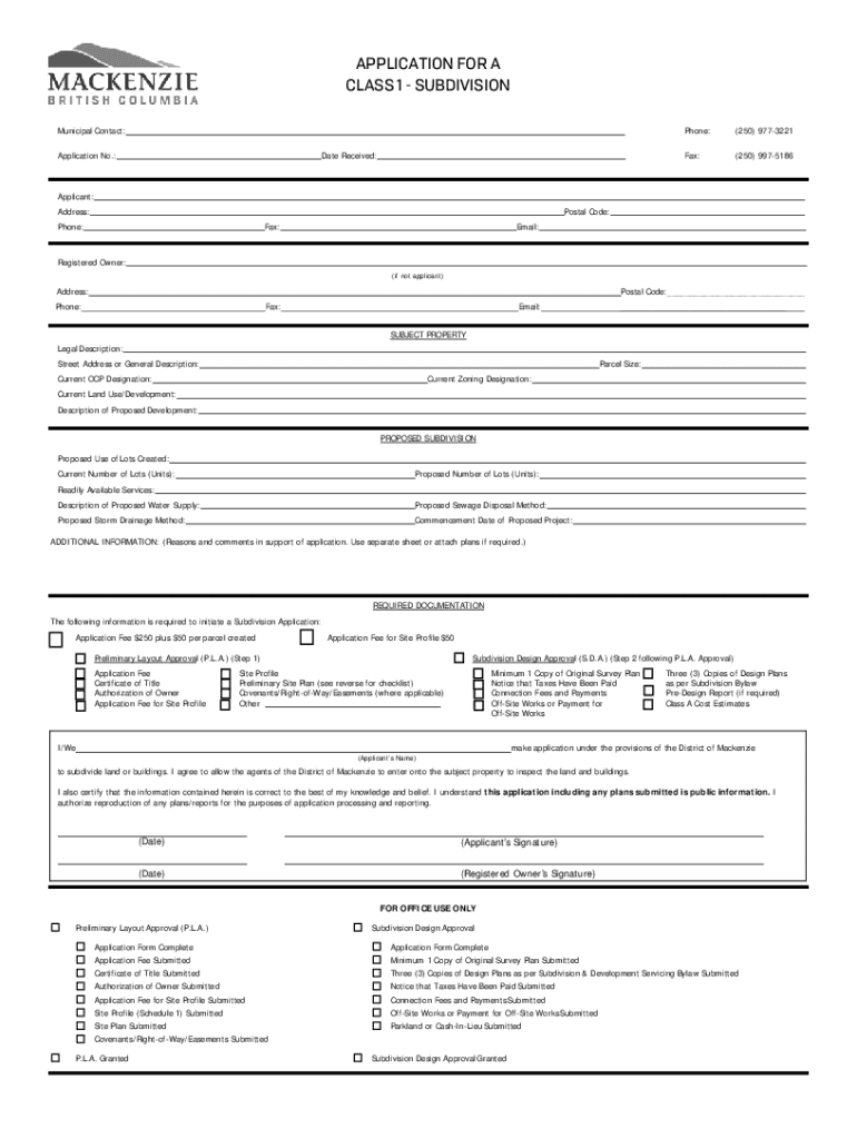 APPLICATION FOR A CLASS 1 SUBDIVISION Municipal Contact: Application No.:Date Received:Phone:(250) 9773221Fax:(250) 9975186Applicant: Address:Postal Code:Phone:Fax:Email:Registered Owner: (if not