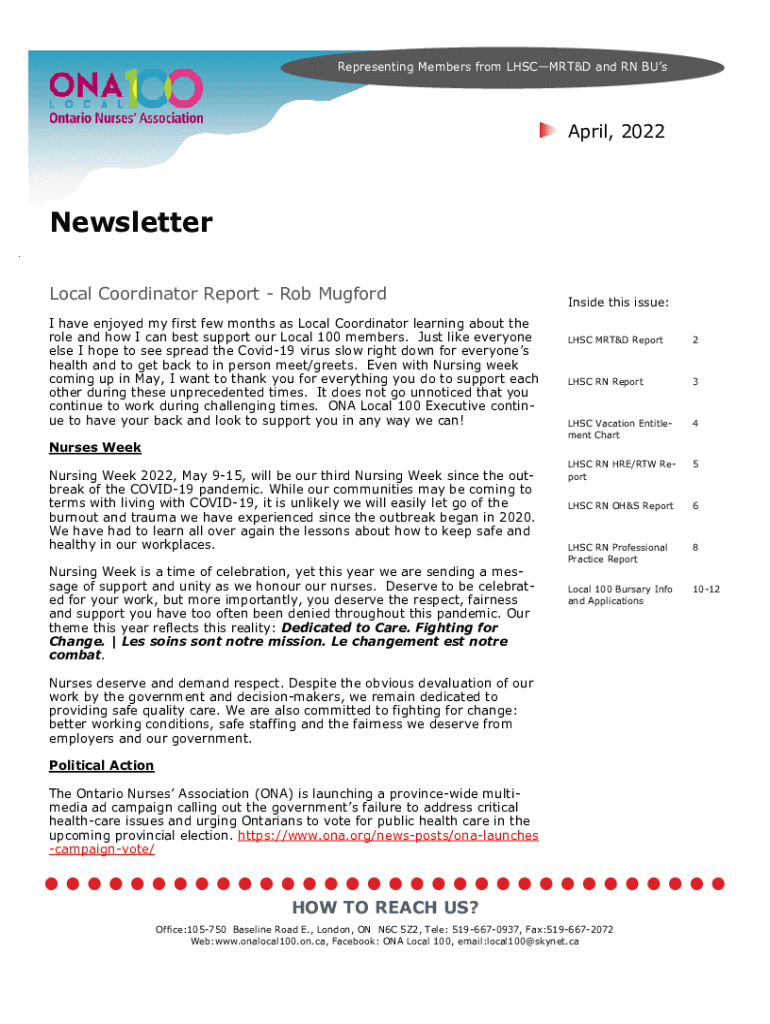 Get the free Newsletter - The Ontario Nurses Association - onalocal100 on