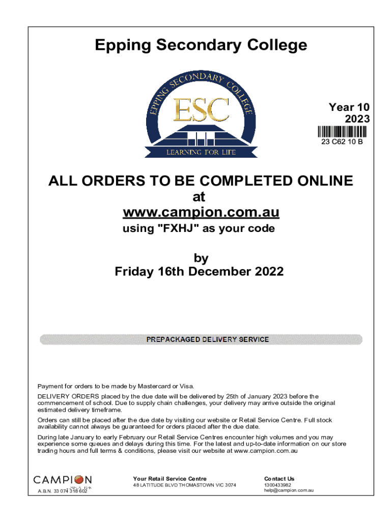 Epping Secondary CollegeYear 10 2023ALL ORDERS TO BE COMPLETED ONLINE at www.campion.com.au using \"FXHJ\" as your codeby Friday 16th December 2022Payment for orders to be made by Mastercard or Visa.