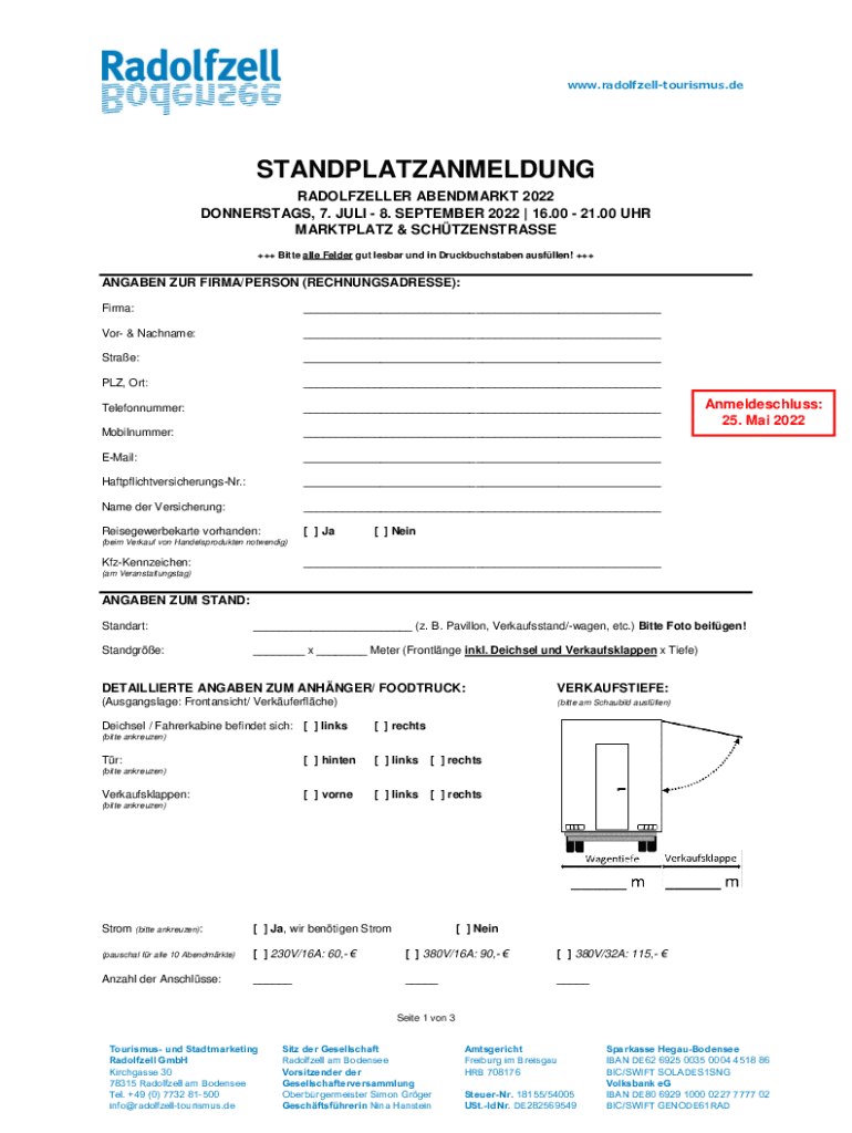 www.radolfzelltourismus.deSTANDPLATZANMELDUNG RADOLFZELLER ABENDMARKT 2022 DONNERSTAGS, 7. JULI 8. SEPTEMBER 2022 | 16.00 21.00 UHR MARKTPLATZ & SCHTZENSTRASSE +++ Bitte alle Felder gut lesbar und