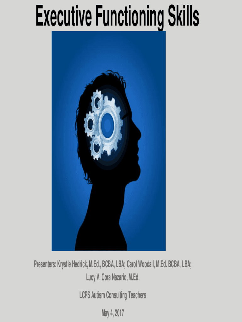 Executive Functioning SkillsPresenters: Krystle Hedrick, M.Ed., BCBA, LBA; Carol Woodall, M.Ed. BCBA, LBA; Lucy V. Cora Nazario, M.Ed.LCPS Autism Consulting Teachers May 4, 2017Getting to Know the