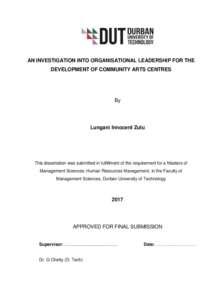 AN INVESTIGATION INTO ORGANISATIONAL LEADERSHIP FOR THE DEVELOPMENT OF COMMUNITY ARTS CENTRESByLungani Innocent ZuluThis dissertation was submitted in fulfillment of the requirement for a Masters