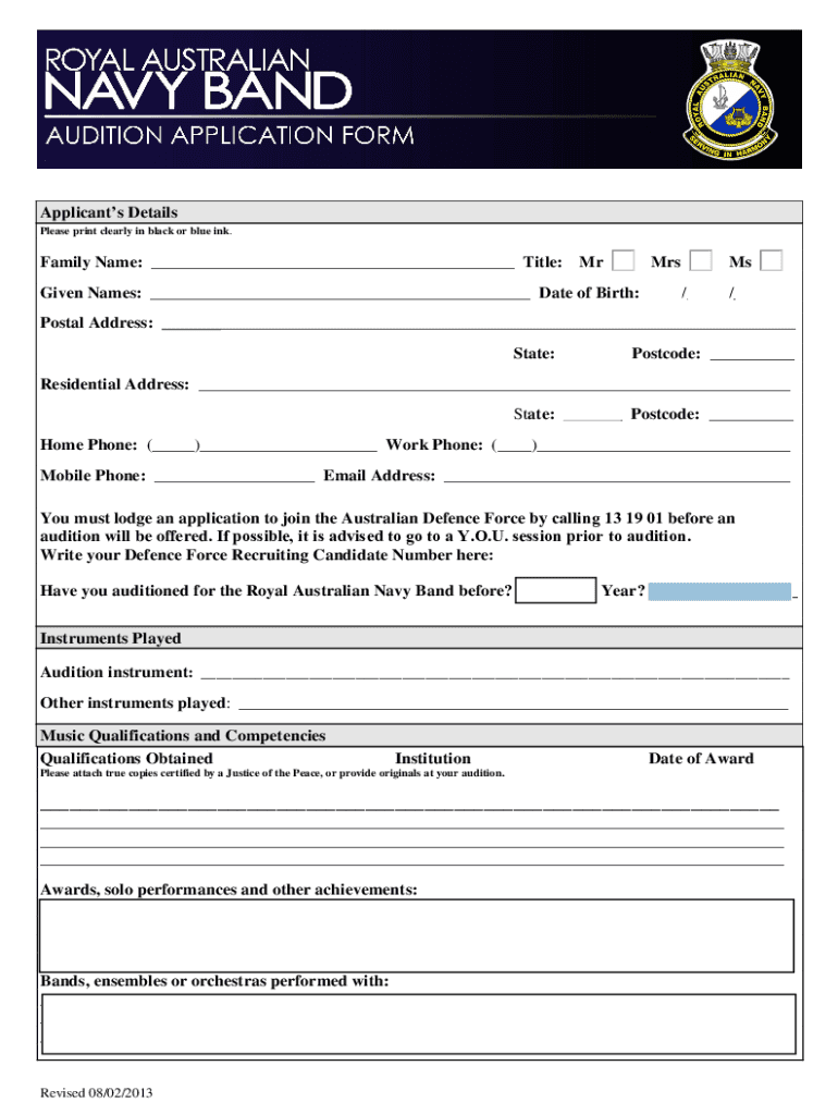 Get the free RAN Band Audition Application Form. RAN Band Musician Recruiting